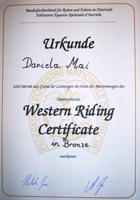 Make me Bronze Nur knapp 4 Monate nach dem Reiterpass war der Wissensdurst von Daniela noch nicht gestillt und das umsatteln auf das heiß geliebte Western stand wieder am Programm. Im Schloss Thalheim bei Kappelln stand das Western Riding Certificate in Bronze auf dem Plan. Gemeinsam mit Alina Rentmeister trat Daniela den schweren Weg vor die Richter Dr. Hilde und Andreas Jarc an.